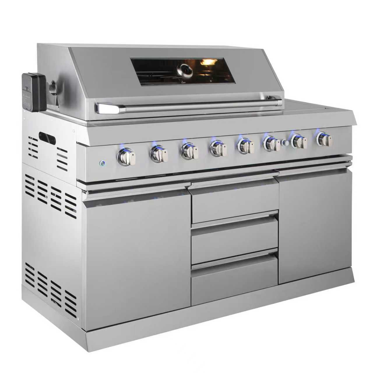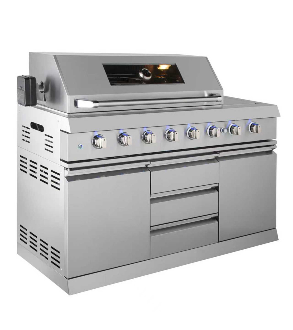 Fabriqué en acier inoxydable 430 ou 304, le barbecue Hyxion offre une puissance totale de 6 x 3,5 kW + 3,8 kW + 2,9 kW (soit 6 × 12 000 BTU + 13 000 BTU + 10 000 BTU). Il est équipé d’un couvercle double paroi, de grilles en acier inoxydable et d’un éclairage LED intégré pour cuisiner même en soirée.