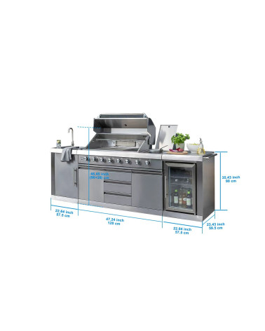 Nettoyer les surfaces inox avec un chiffon humide et un produit doux. Protéger la cuisine avec une housse lorsqu’elle n’est pas utilisée. Livraison en modules prêts à assembler.