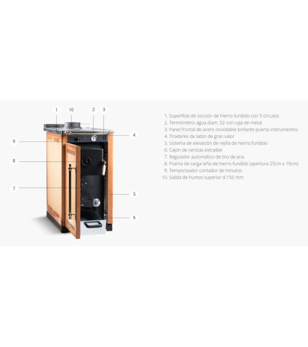 Notre cuisinière à bois MINI est dotée d'un design traditionnel avec une touche d'élégance, qui s'intègre facilement dans de petits espaces, grâce à ses petites dimensions. Son esthétique traditionnelle ajoute une touche chaleureuse et rustique à l'espace.