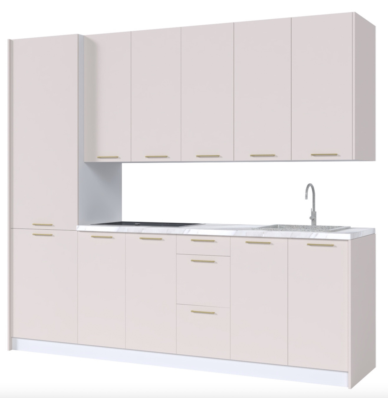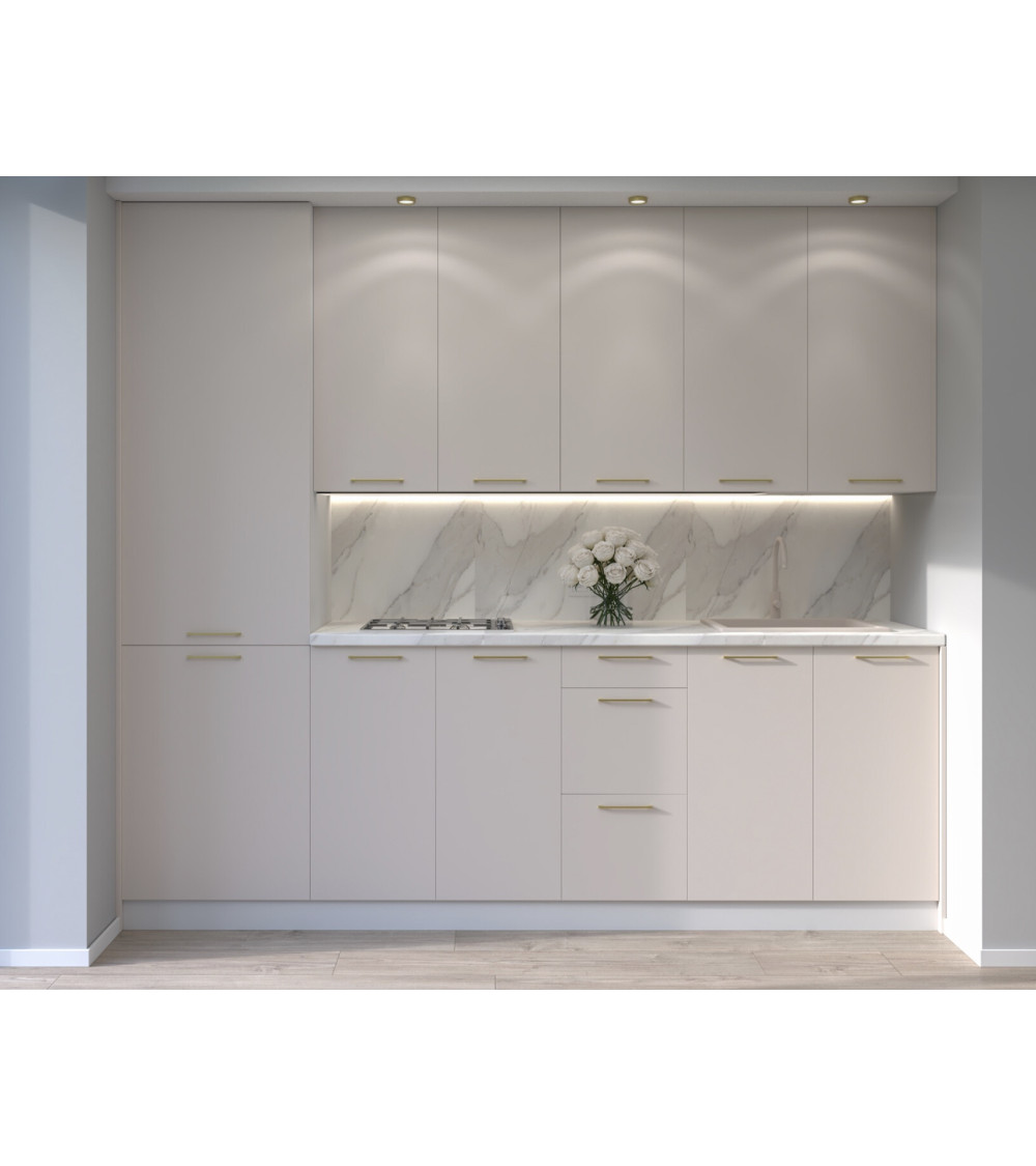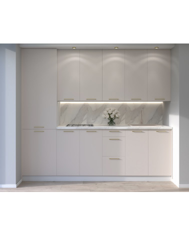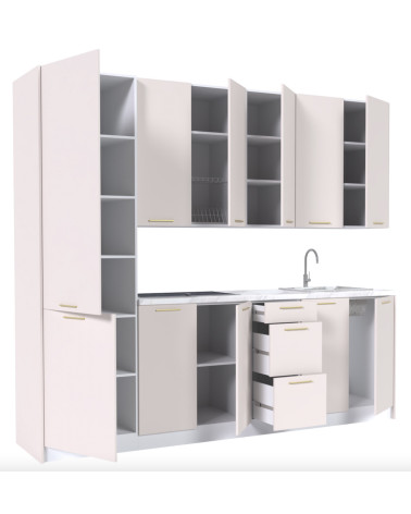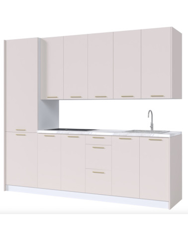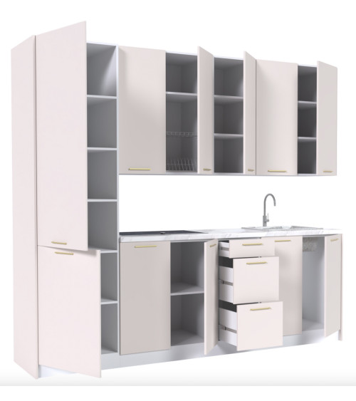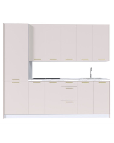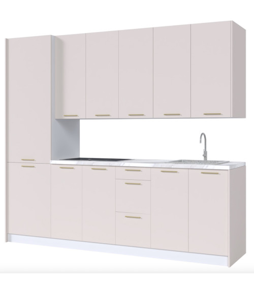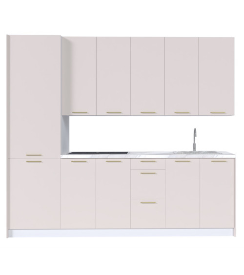 Redonnez vie à votre cuisine avec l'ensemble Leo 260 cm cachemire : élégance dorée, rangements ingénieux et structure renforcée pour un quotidien stylé et organisé.