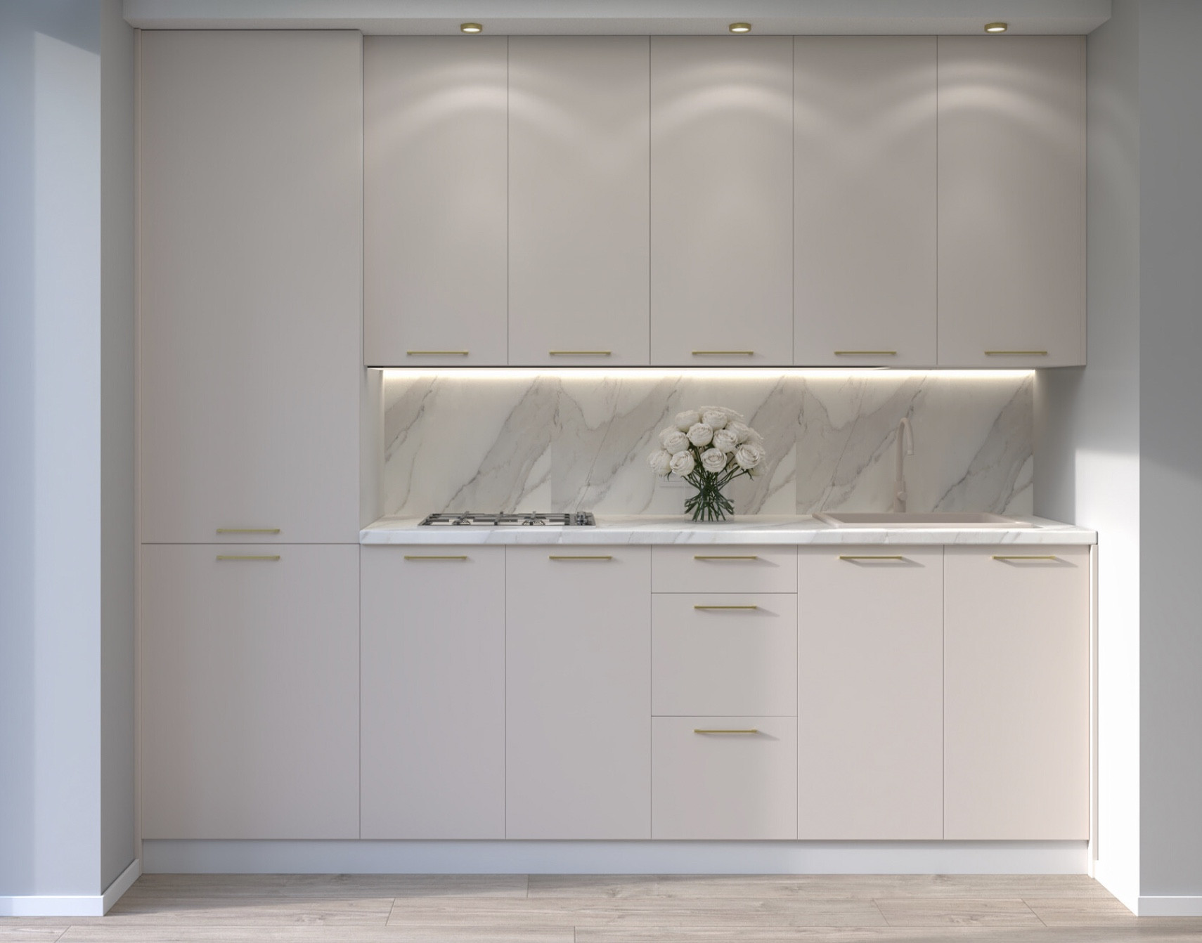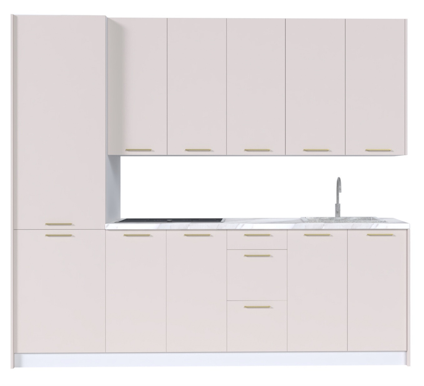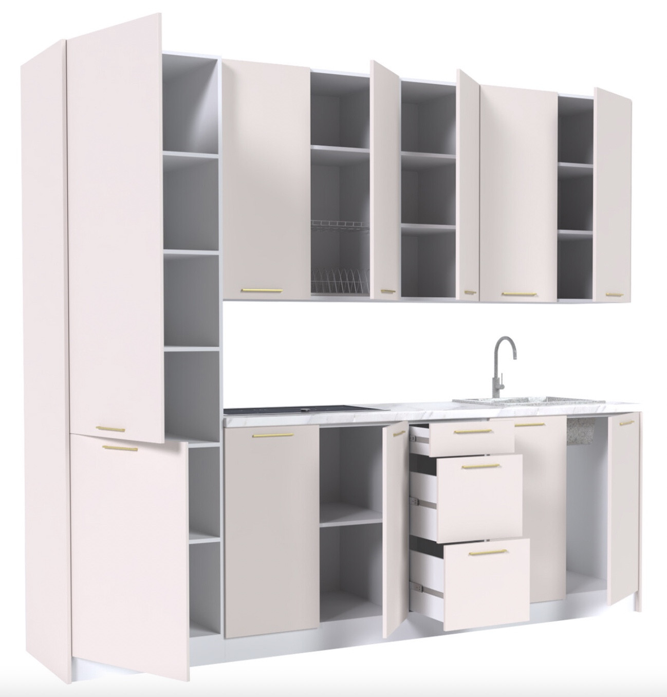 Redonnez vie à votre cuisine avec l'ensemble Leo 260 cm cachemire : élégance dorée, rangements ingénieux et structure renforcée pour un quotidien stylé et organisé.