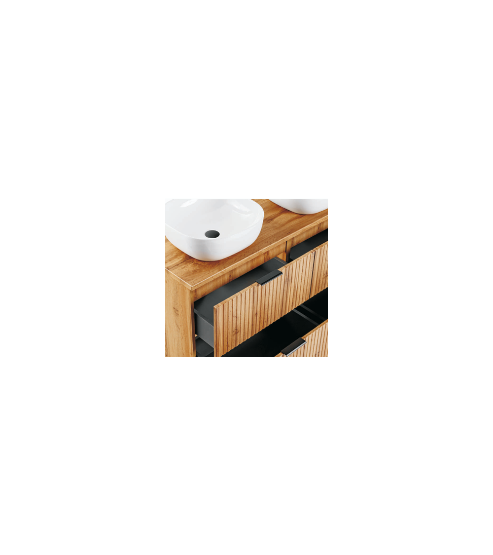 L'ensemble ADEL OAK transforme votre salle de bain en un espace moderne et chaleureux. Avec son plan vasque en bois de chêne et ses deux lavabos Smile, il répond parfaitement aux besoins des familles ou des couples recherchant confort et style.
