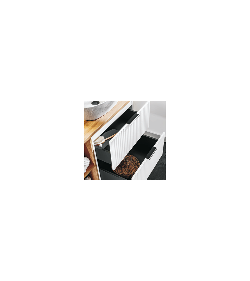 La colonne haute et les meubles sous vasque offrent une solution de rangement fonctionnelle et esthétique, parfaite pour garder tous vos essentiels à portée de main. Laissez cet ensemble transformer votre espace en un lieu accueillant et harmonieux.