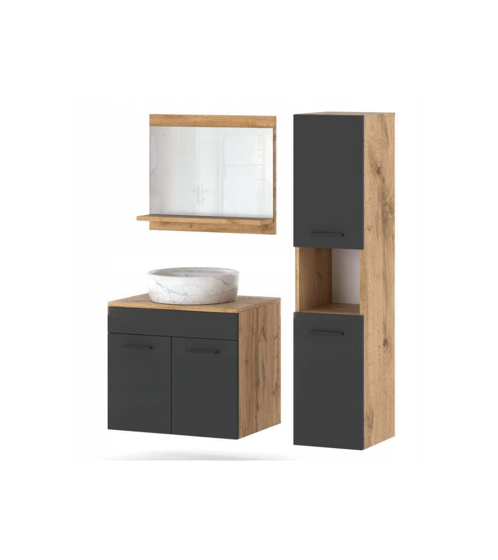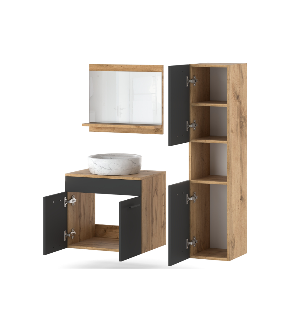 Avec une colonne pratique, un meuble ergonomique et un miroir avec étagère, cet ensemble est conçu pour répondre à vos besoins de rangement tout en apportant une touche contemporaine à votre pièce.