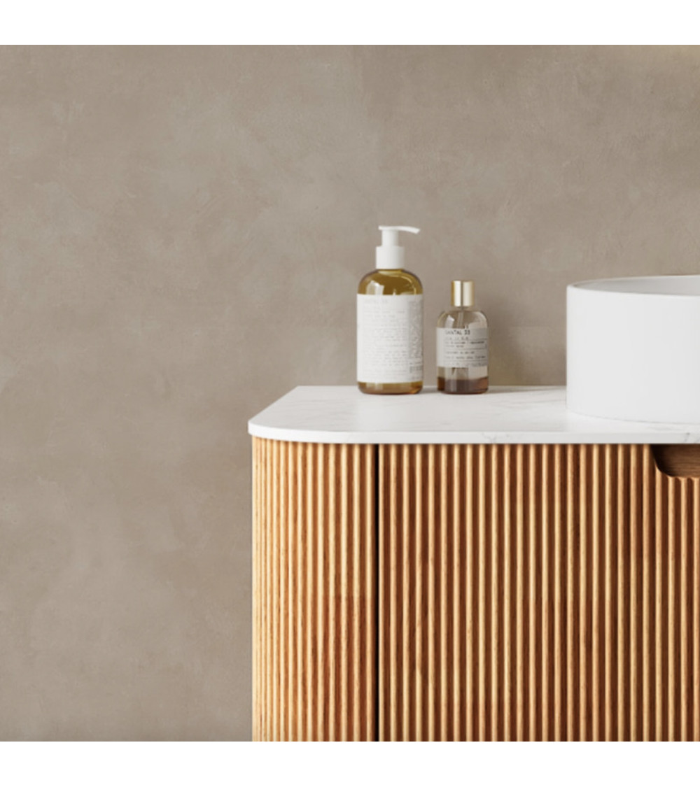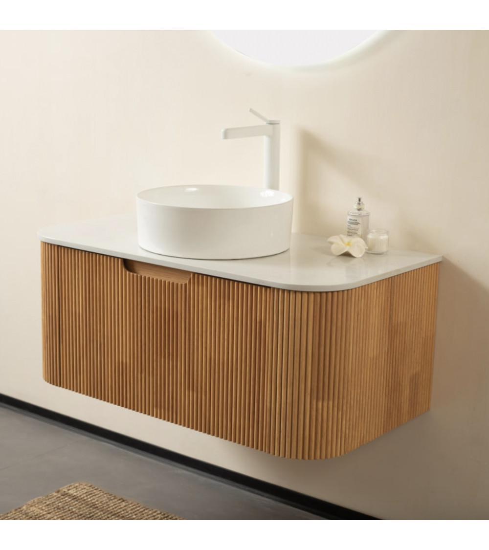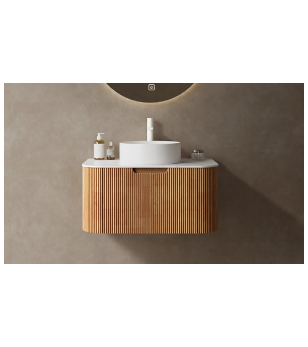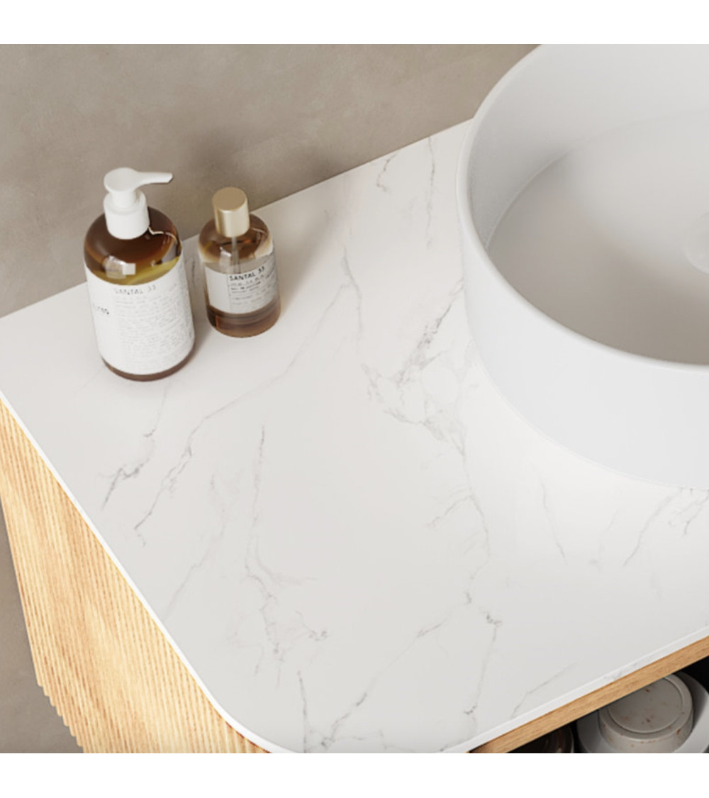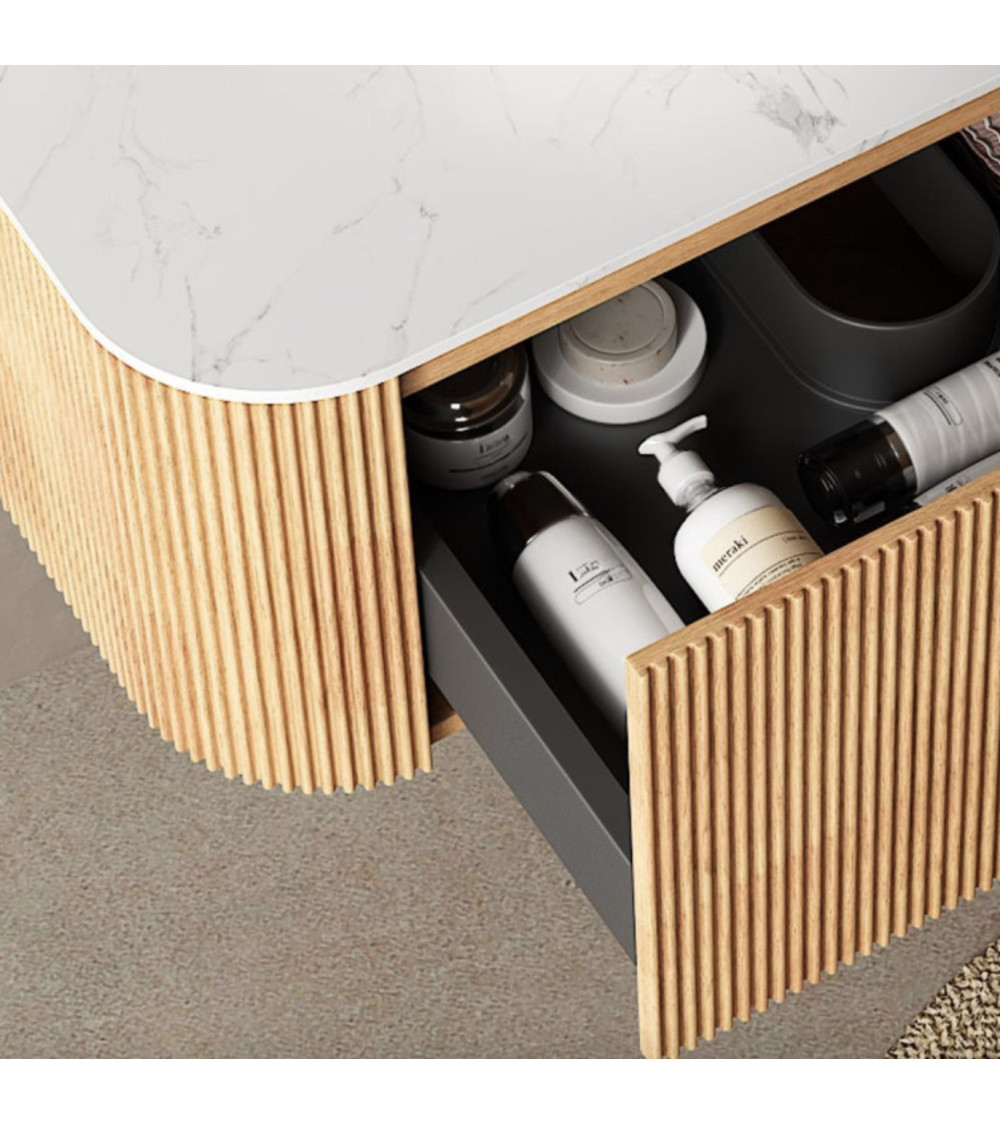 Son contreplaqué en chêne multicouche 18 mm résiste à l’eau et à l’humidité ; le meuble reste stable même en conditions exigeantes. La façade à rayures verticales 3D capte la lumière, le placage en chêne massif révèle un veinage authentique, et le plan en marbre artificiel assure un point d’appui chic et facile à nettoyer.