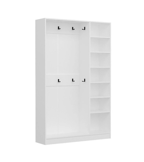Derrière deux des portes, vous découvrirez un espace astucieusement aménagé avec plusieurs crochets porte-manteaux. Ces crochets offrent un endroit pratique pour suspendre vos manteaux, sacs, et accessoires, assurant ainsi une entrée ordonnée et accueillante. L'agencement intérieur a été conçu pour maximiser l'espace de suspension, permettant de garder vos articles essentiels à portée de main.