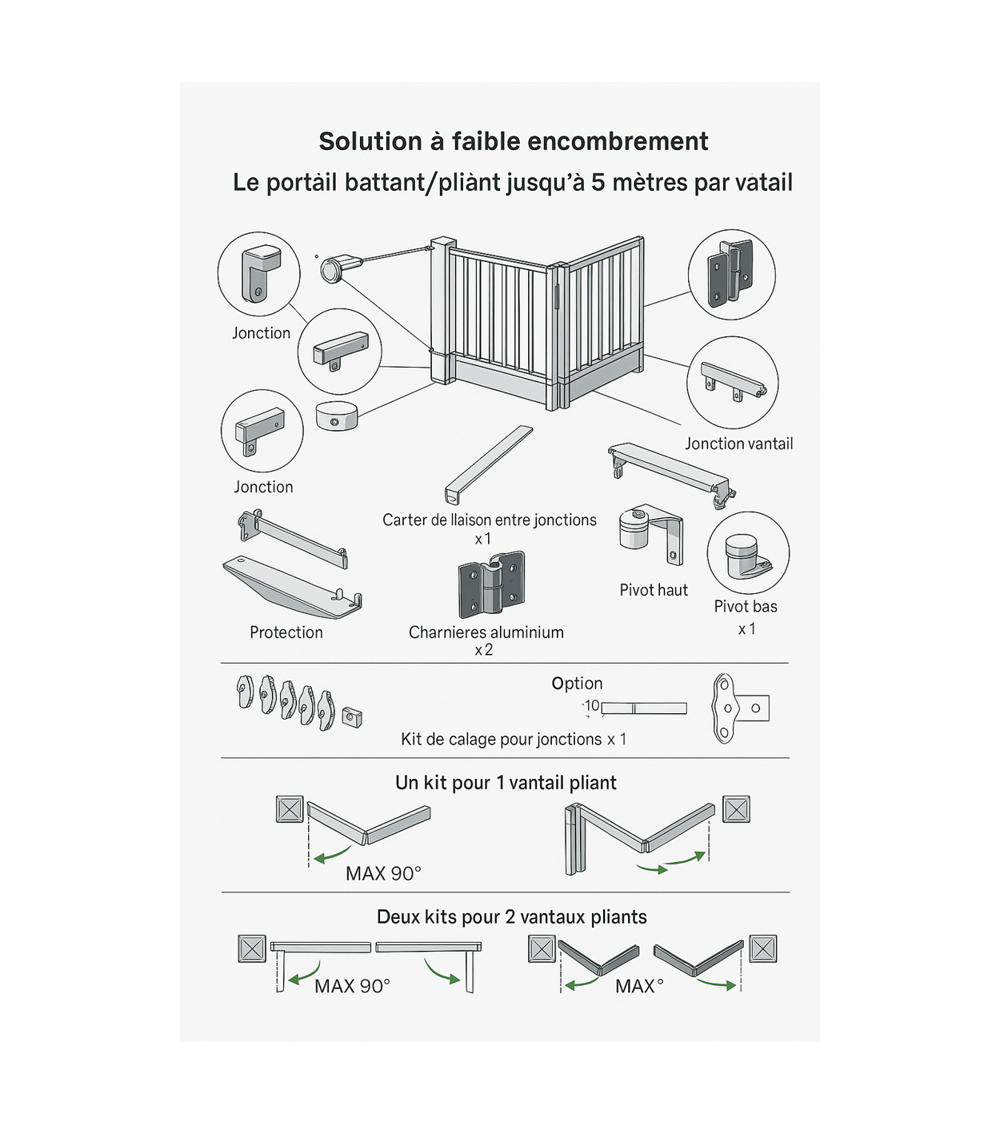Pensé deux vantaux, ce portail battant pliable s’intègre harmonieusement aux espaces restreints. Son ouverture motorisée se fait vers l’intérieur de la propriété, optimisant ainsi chaque mètre carré disponible.