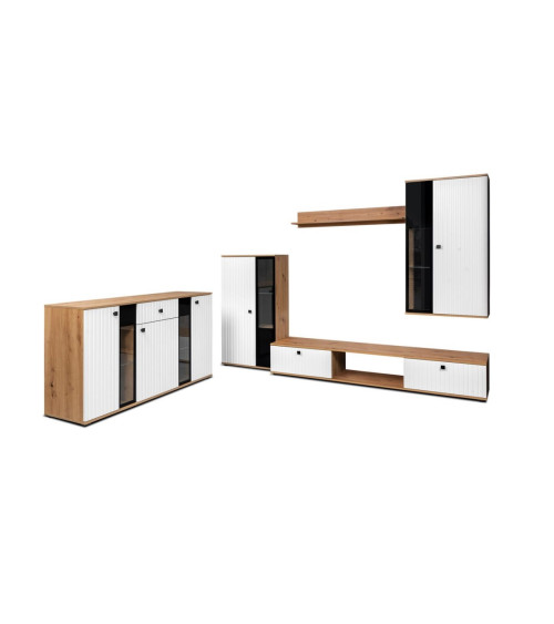 Ce salon complet CALI allie élégance contemporaine et fonctionnalité pratique pour transformer votre espace de divertissement. Cet ensemble apporte une touche de modernité à votre salon tout en conservant une esthétique chaleureuse grâce à ses coloris chêne et blanc.