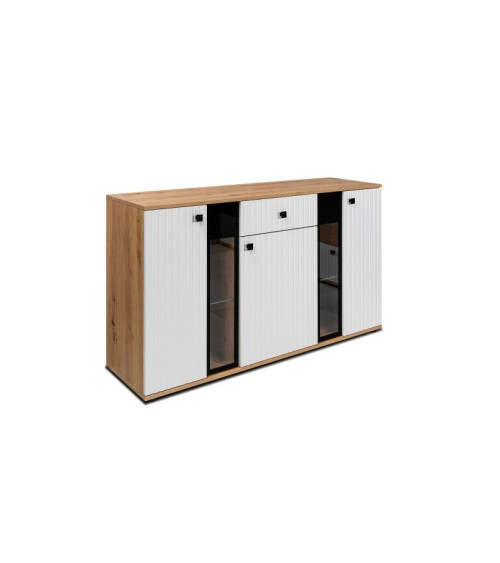 Le buffet muni de 3 portes pleines, un tiroir et 2 façades vitrées pour exposer vos objets de décoration, possède un grand espace de rangement pour votre vaisselle ou vos affaires que vous souhaitez bien rangées.