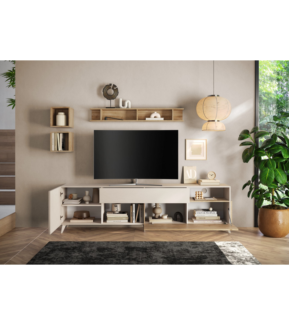 Le meuble TV, est un mariage parfait entre modernité et chaleur naturelle. Sa finition cashmere apporte une touche de douceur et de raffinement, tandis que le chêne Cadiz ajoute une touche de caractère rustique et authentique. Avec ses compartiments spacieux, il offre un espace organisé pour vos appareils multimédias tout en ajoutant une esthétique élégante à votre espace de divertissement.