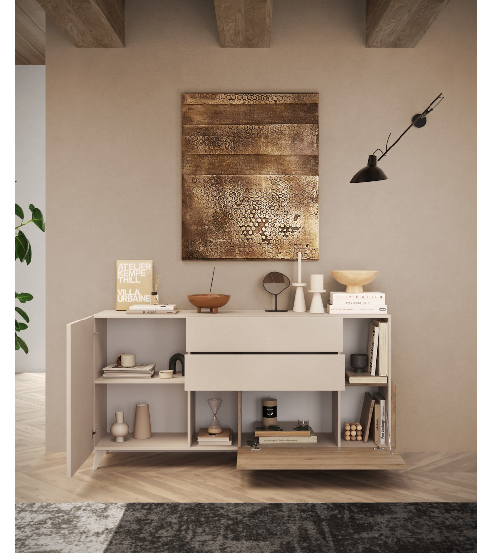 Le buffet offre un espace de rangement généreux pour vos ustensiles de table, vos nappes et vos objets précieux. La combinaison de cashmere et de chêne Cadiz crée un contraste subtil et sophistiqué, ajoutant une touche de style contemporain à votre salle à manger tout en préservant une ambiance chaleureuse et accueillante.
