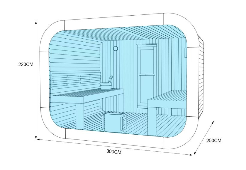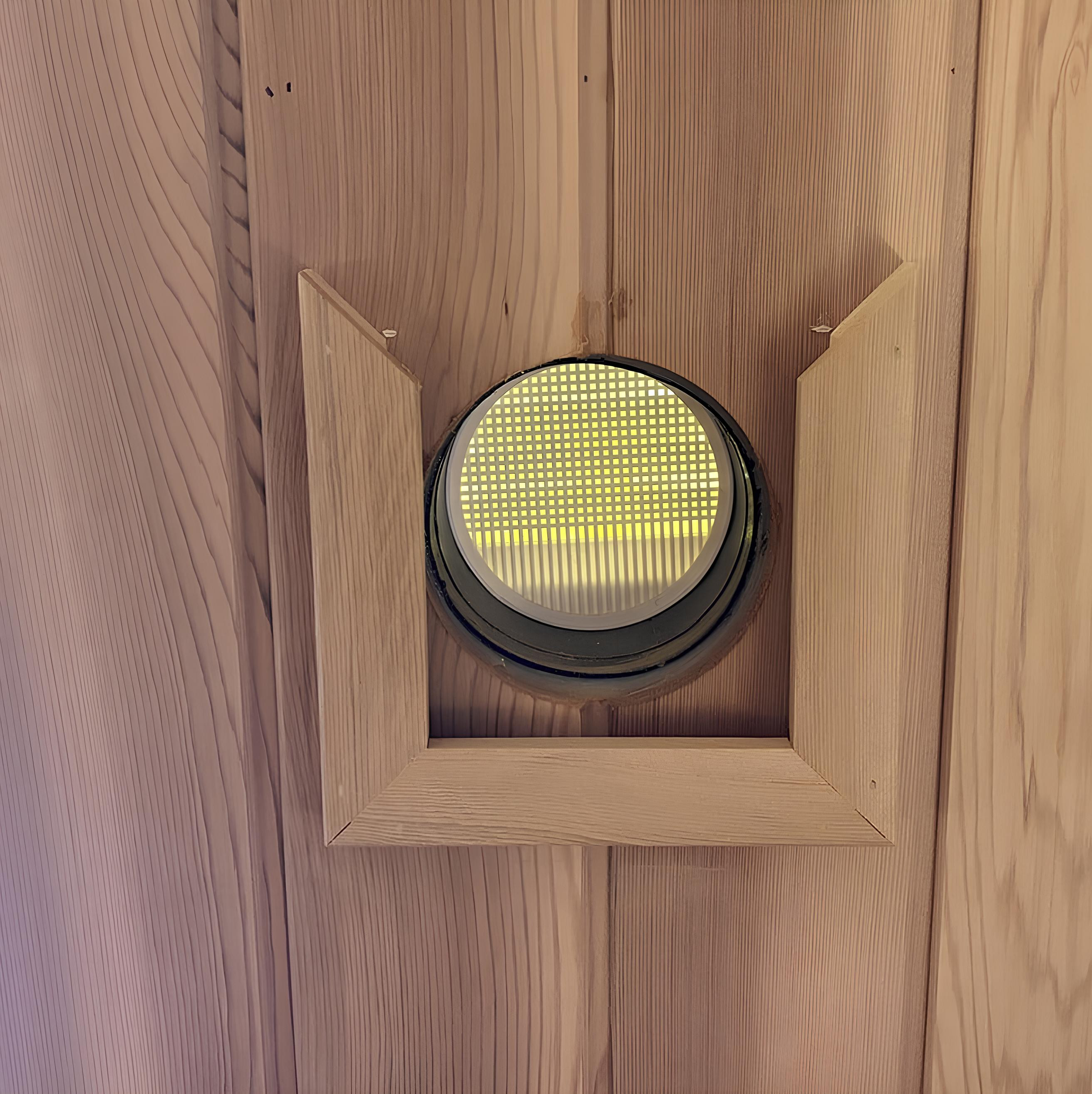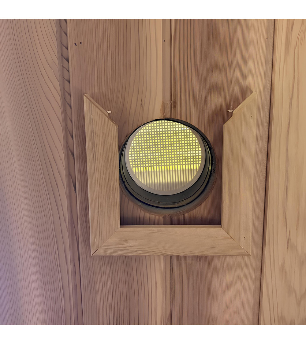 Le poêle électrique 6 kW associé à des pierres volcaniques chauffe rapidement votre cabine (70 °C en ± 20 min) et permet d’atteindre jusqu’à 100 °C. L’intérieur accueille 4 à 6 personnes sur un banc ergonomique, parfait pour un moment de détente en famille ou entre amis.