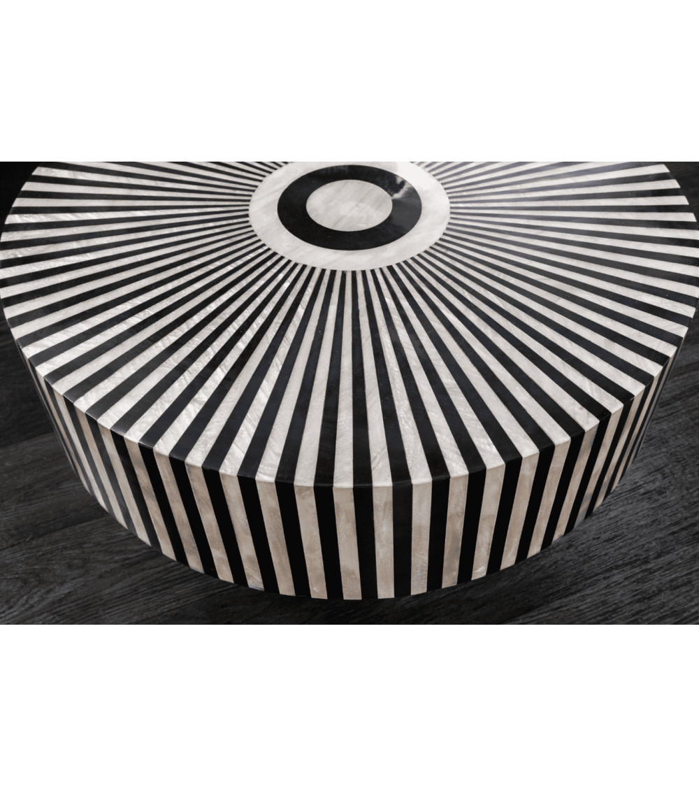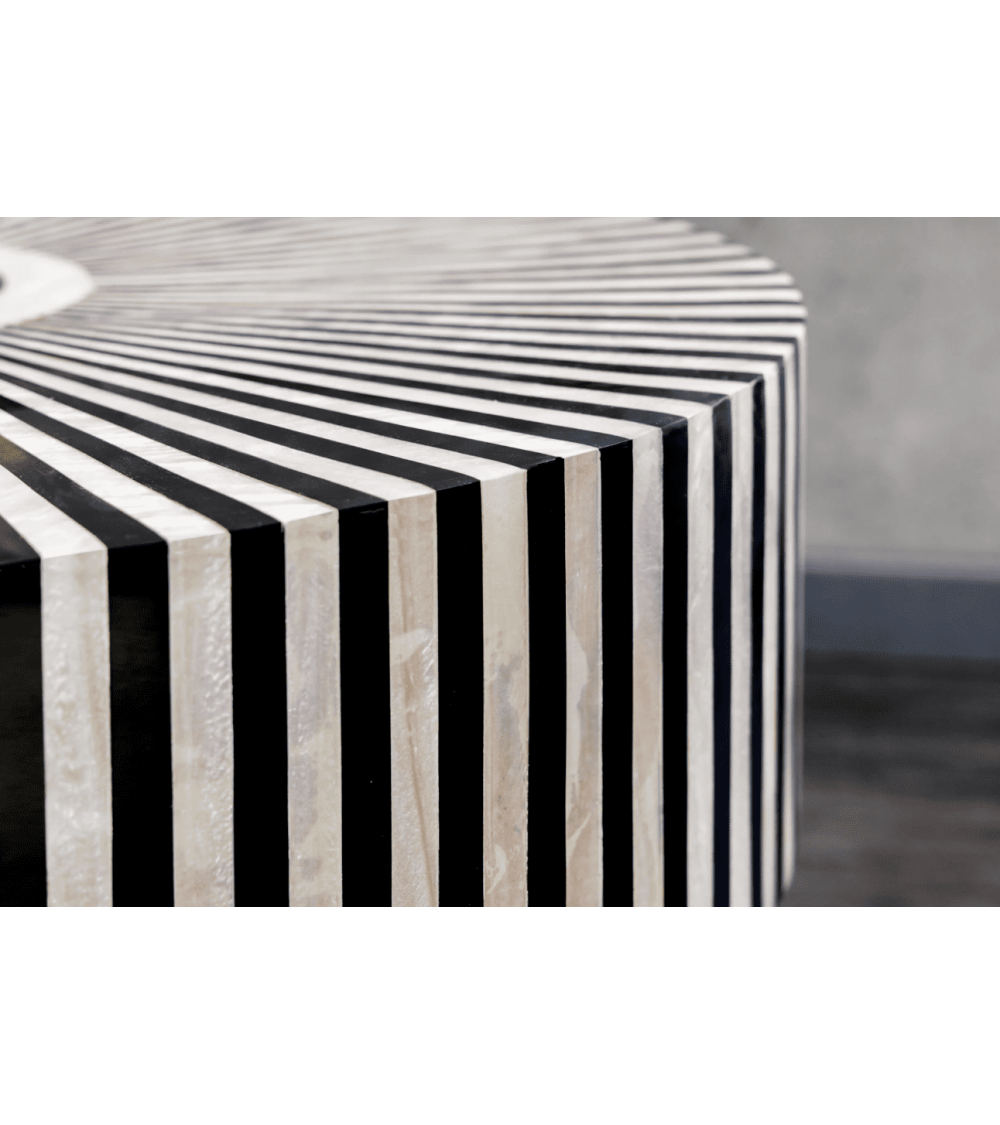Apportez une touche d'élégance unique à votre intérieur avec la table basse BONE INLAY 60 cm en polyresine et os de buffle noir et blanc. Ce chef-d'œuvre artisanal allie matériaux naturels et design moderne pour transformer votre espace de vie.