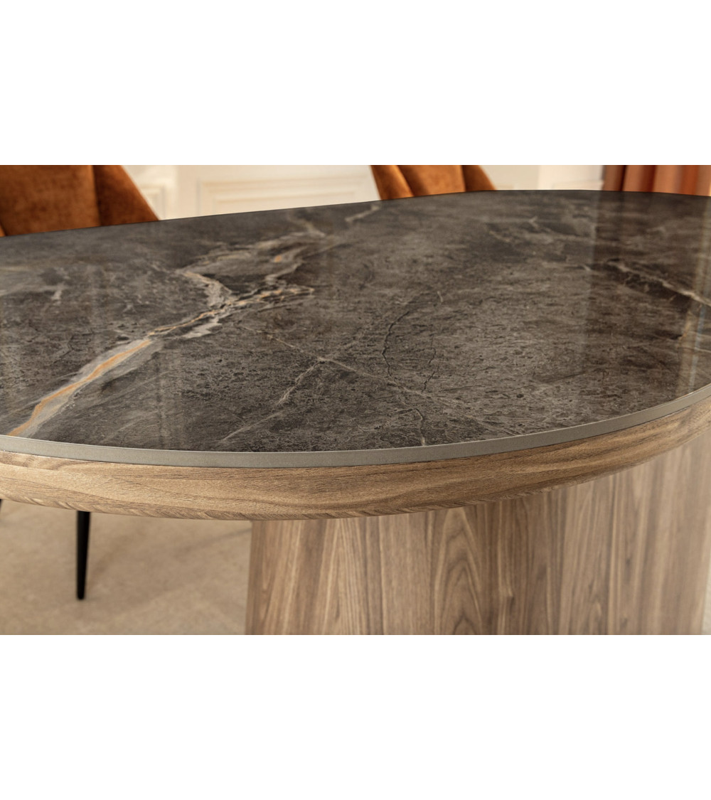 La Table de salon UNIQUE 200 cm n’est pas qu’un simple meuble : c’est une pièce maîtresse qui sublime votre séjour. Grâce à son plateau en céramique imitation marbre gris, elle reflète une atmosphère raffinée tout en étant très simple à nettoyer. Son piètement en bois plaqué noyer assure une stabilité optimale et apporte une chaleur naturelle à votre décoration.