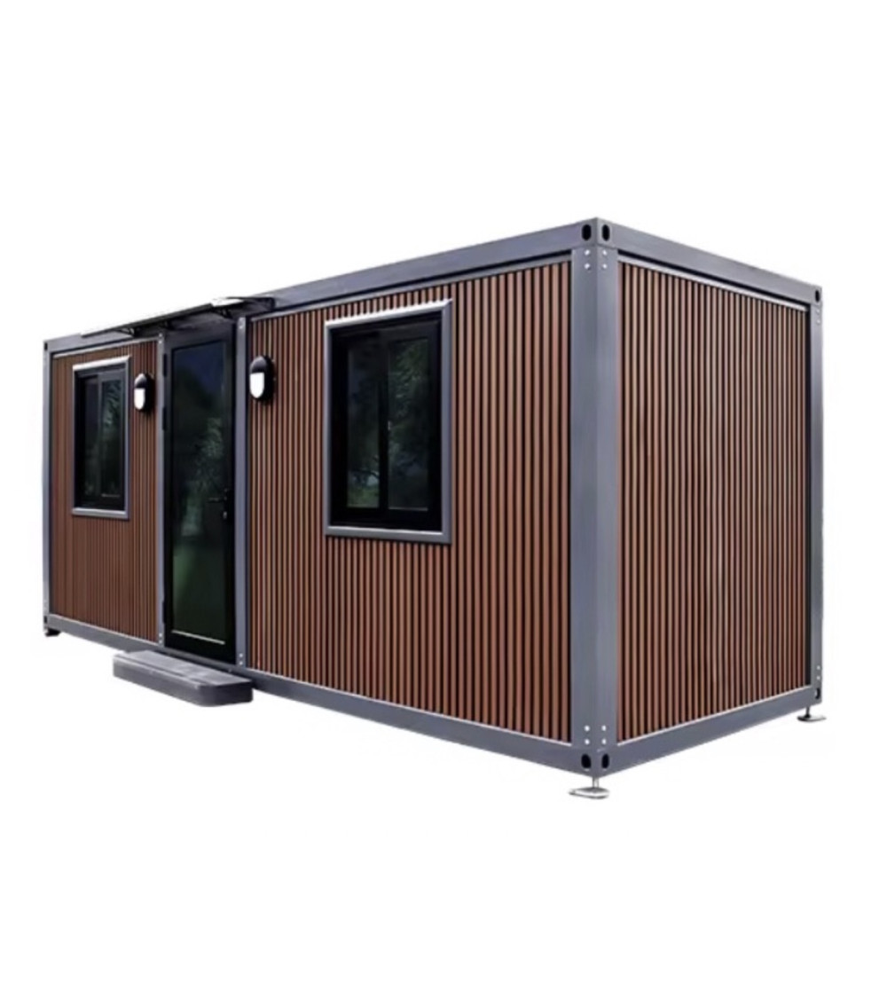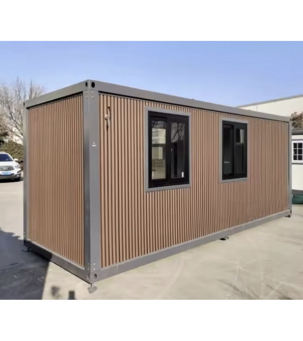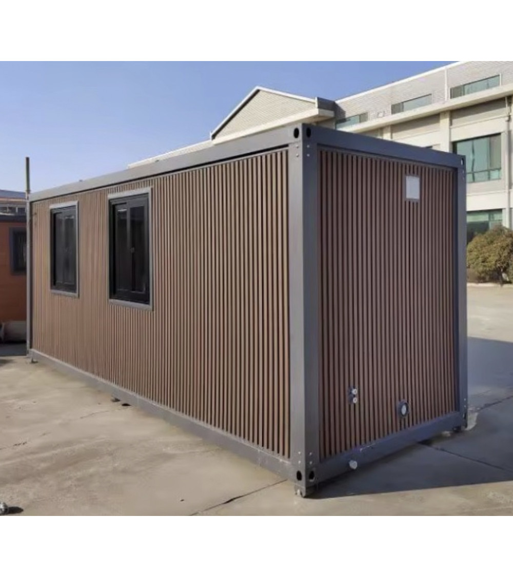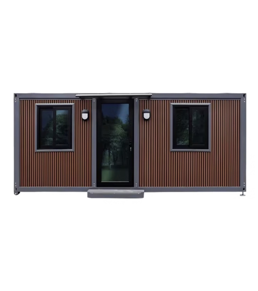 Il Container PR2 conquista con la sua estetica moderna grazie al rivestimento effetto legno con doghe verticali, elegantemente incorniciato da una struttura metallica grigio antracite che ne valorizza le linee contemporanee.