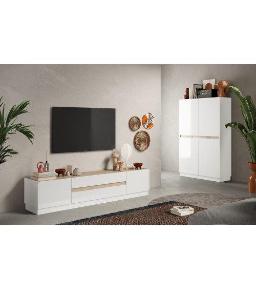 Meuble TV FANTASY Blanc laqué/chêne Cadiz 205 cm