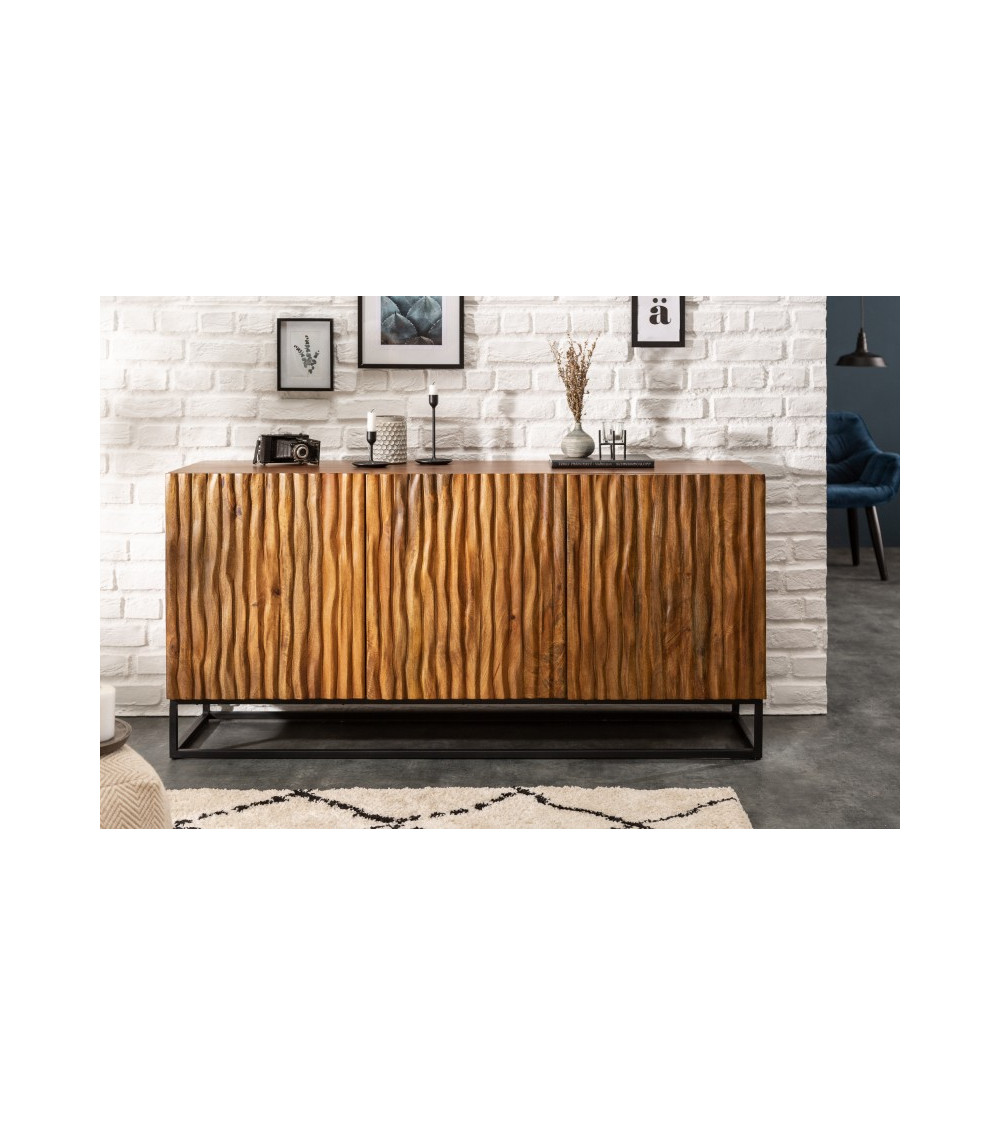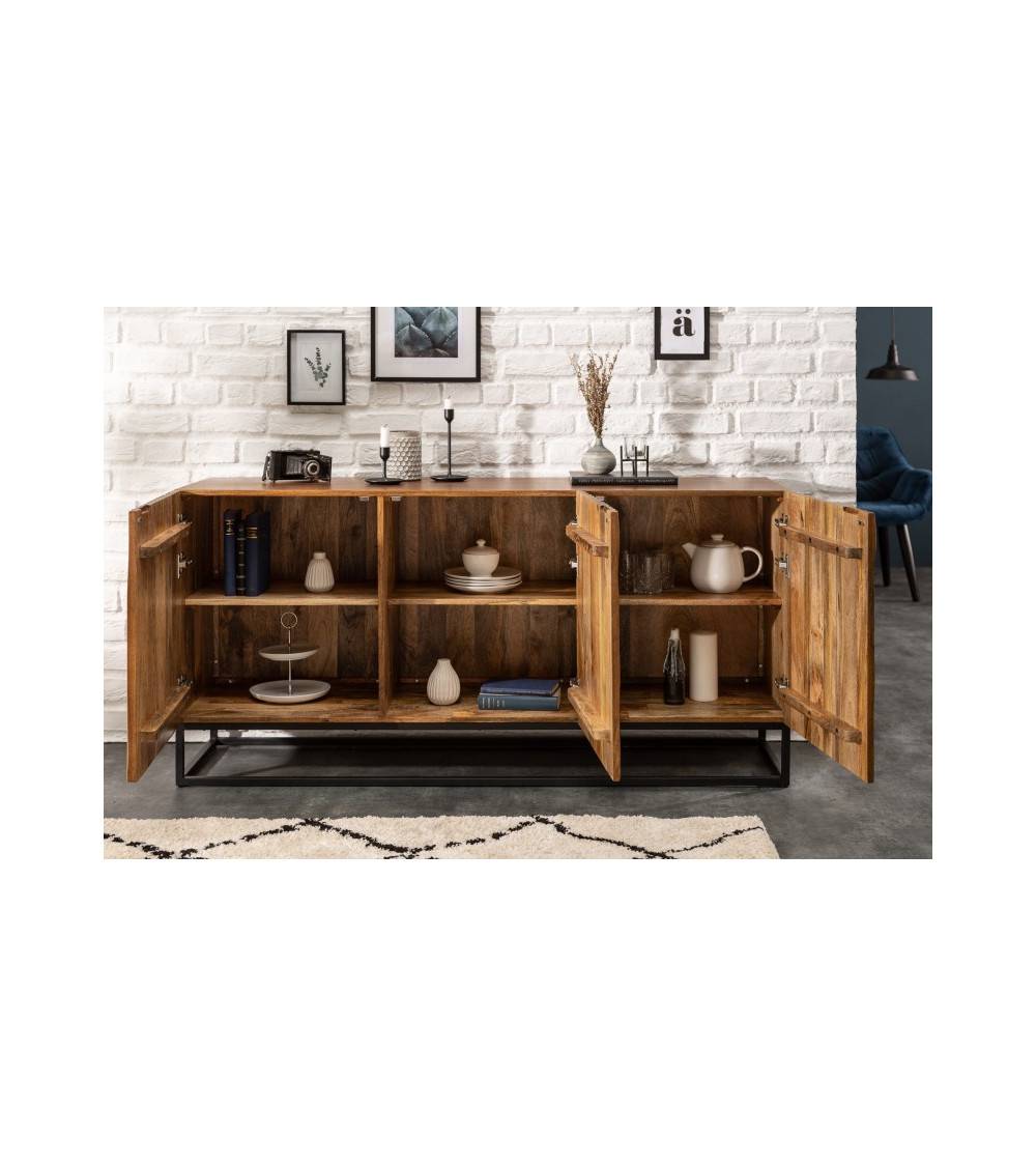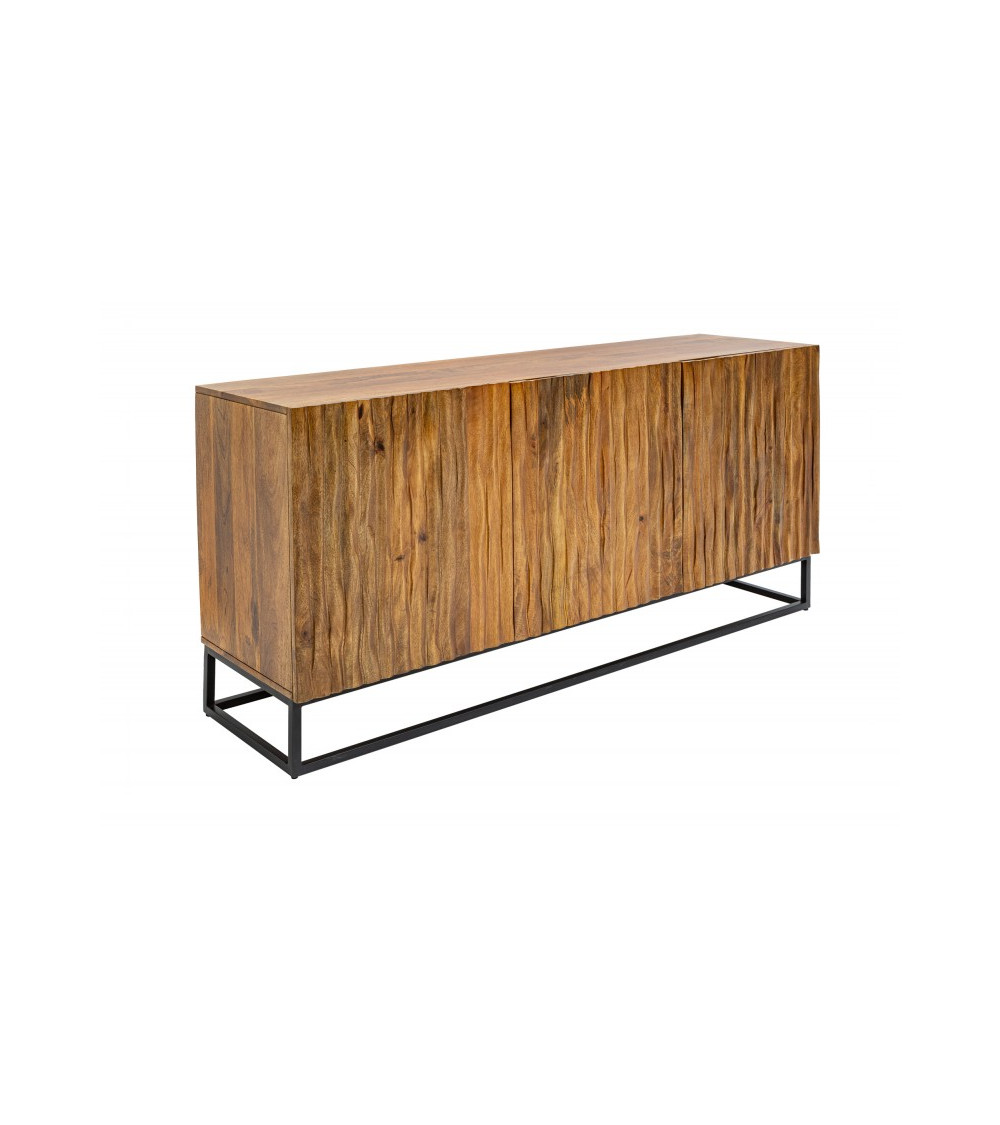 Il corpo della credenza è realizzato in legno massiccio di mango, rinomato per la sua robustezza e per le bellissime venature. Ogni anta della credenza è incorniciata in metallo e presenta un design unico che evoca la corteccia naturale degli alberi, accentuando l'aspetto organico del mobile. La finitura sigillata e verniciata protegge il legno e ne esalta la bellezza naturale, rendendo ogni pezzo un'opera d'arte unica.