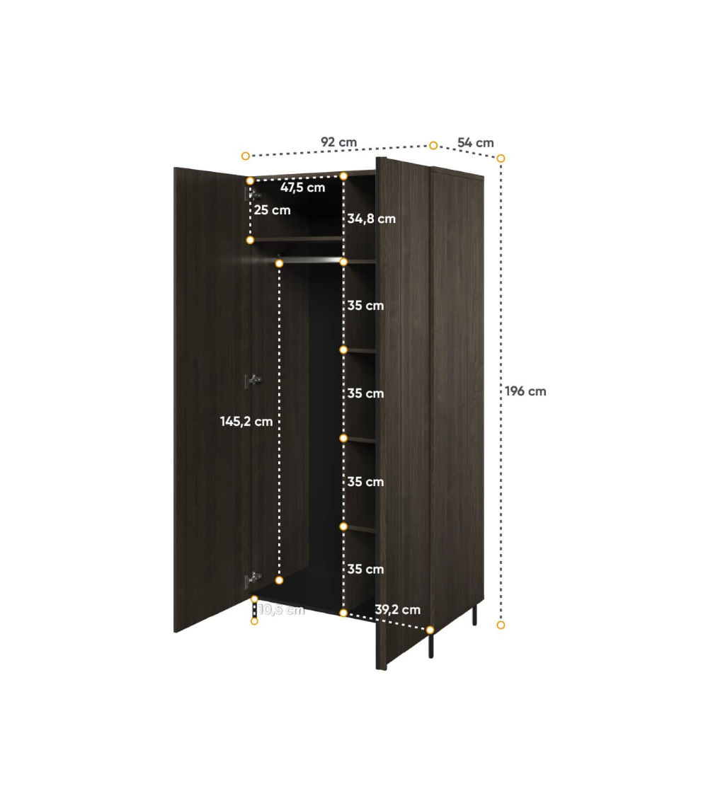 L'armadio Piemonte della collezione offre praticità e stile, ideale per chi cerca un elemento funzionale e decorativo. I ripiani e l'asta appendiabiti consentono di organizzare abiti e accessori con facilità, mantenendo il soggiorno ordinato.