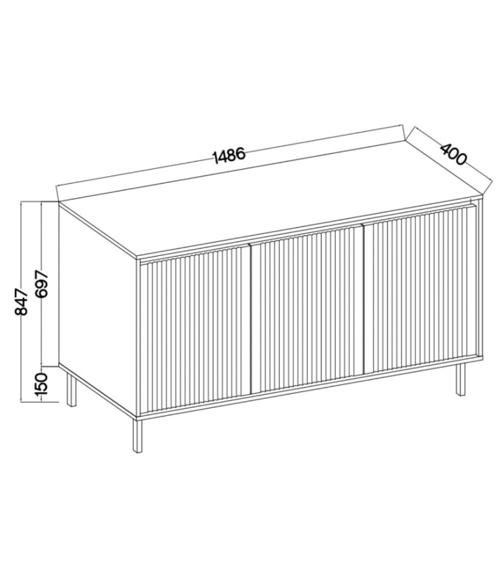 Con le sue tre ante e tre ripiani interni, offre un ampio spazio per piatti, accessori o oggetti decorativi. La fascia nera orizzontale aggiunge un tocco grafico sottile, creando un bel contrasto con i piedini in metallo nero.