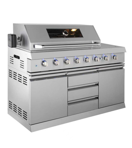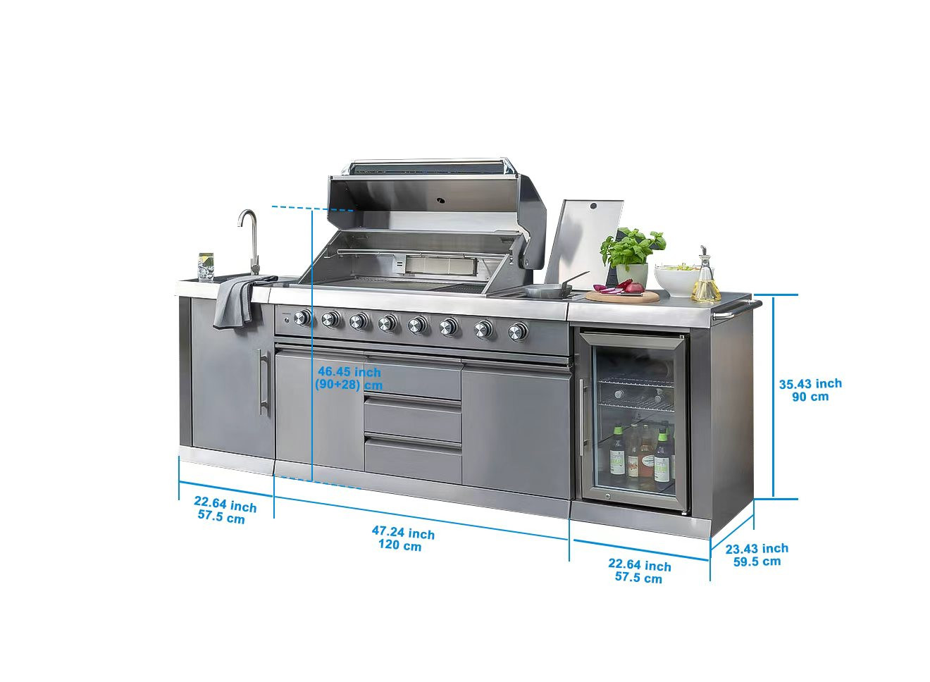 La sua ampia superficie di lavoro include un lavello integrato e una griglia con 6 bruciatori potenti, perfetti per cucinare carne, pesce, verdure o frutta alla griglia con precisione.
