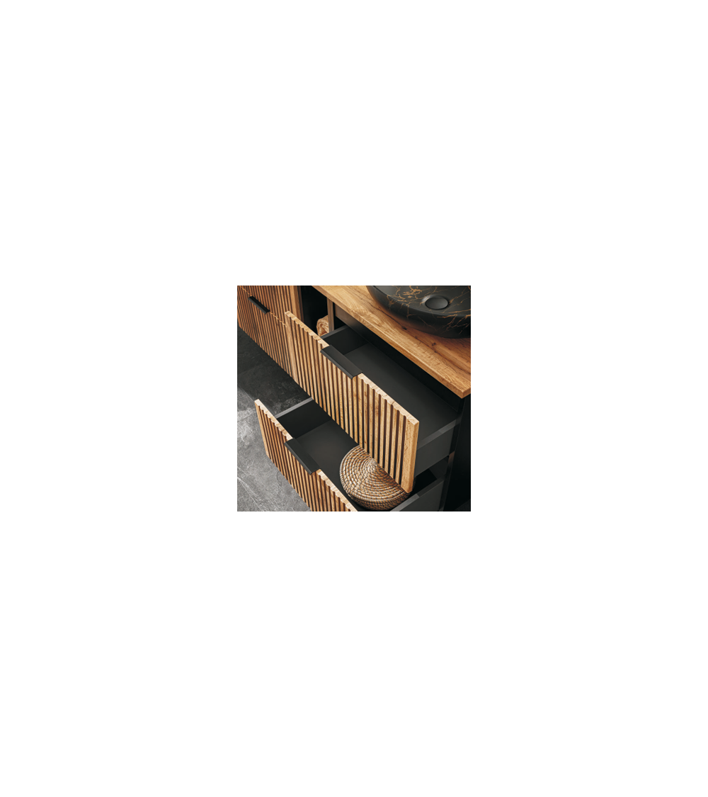 Il set Xilo Wotan è perfetto per chi cerca un bagno moderno e funzionale. La combinazione del legno naturale Wotan e tonalità scure crea un'atmosfera accogliente e sofisticata. Il doppio lavabo e gli specchi LED Apollo trasformano la routine quotidiana in un momento di piacere.
