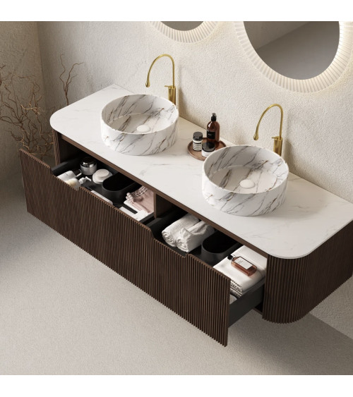 Con il Mobile da bagno David, trasforma il tuo spazio in una vera oasi di relax. Il suo rovere massiccio di alta qualità e la finitura a doghe 3D esaltano l’autenticità del materiale naturale. Ogni dettaglio è stato pensato per unire estetica e praticità nella vita quotidiana.