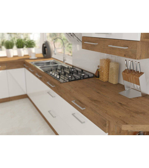 - Materiale frontale: pannello laminato rovere lancelot da 16 mm / MDF bianco lucido da 16 mm