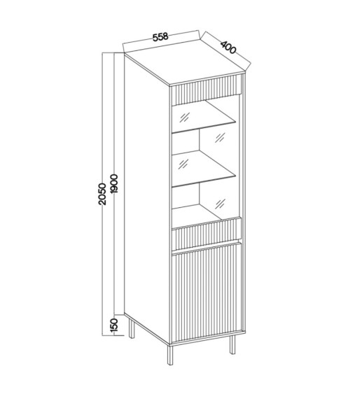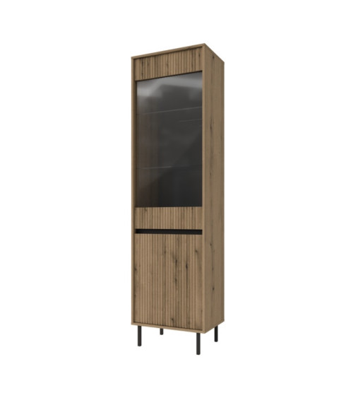 | VETRINA | Dimensioni: 55 x 205 x 40 cm 2 ante (1 in vetro temprato antisol graphite + 1 piena) 3 ripiani (2 in vetro trasparente da 5 mm) Interno bicolore rovere/nero |