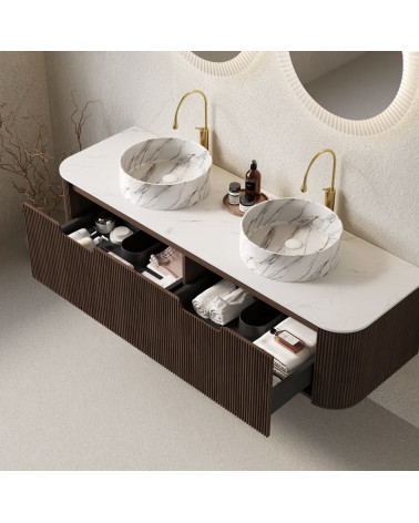 En MDF de haute qualité, ses façades laquées relevées par des nuances de bois confèrent à l’ensemble une délicate et luxueuse simplicité.