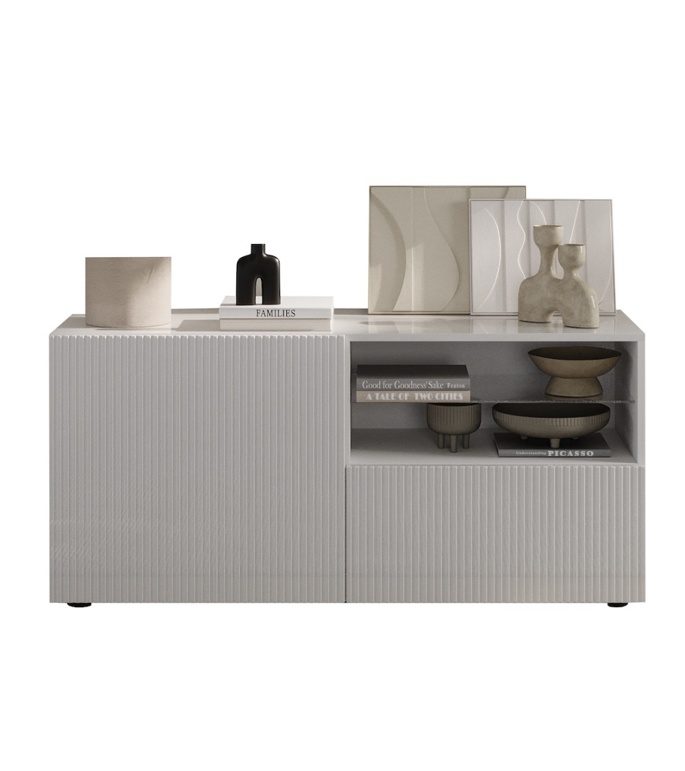Os pés discretos separam ligeiramente o banco do televisor do chão.