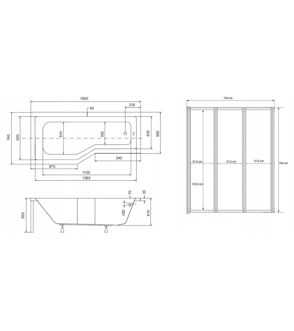 Avental frontal preto e painel lateral preto: Estes elementos conferem um toque de modernidade e contraste à sua casa de banho, protegendo simultaneamente as estruturas internas da banheira.