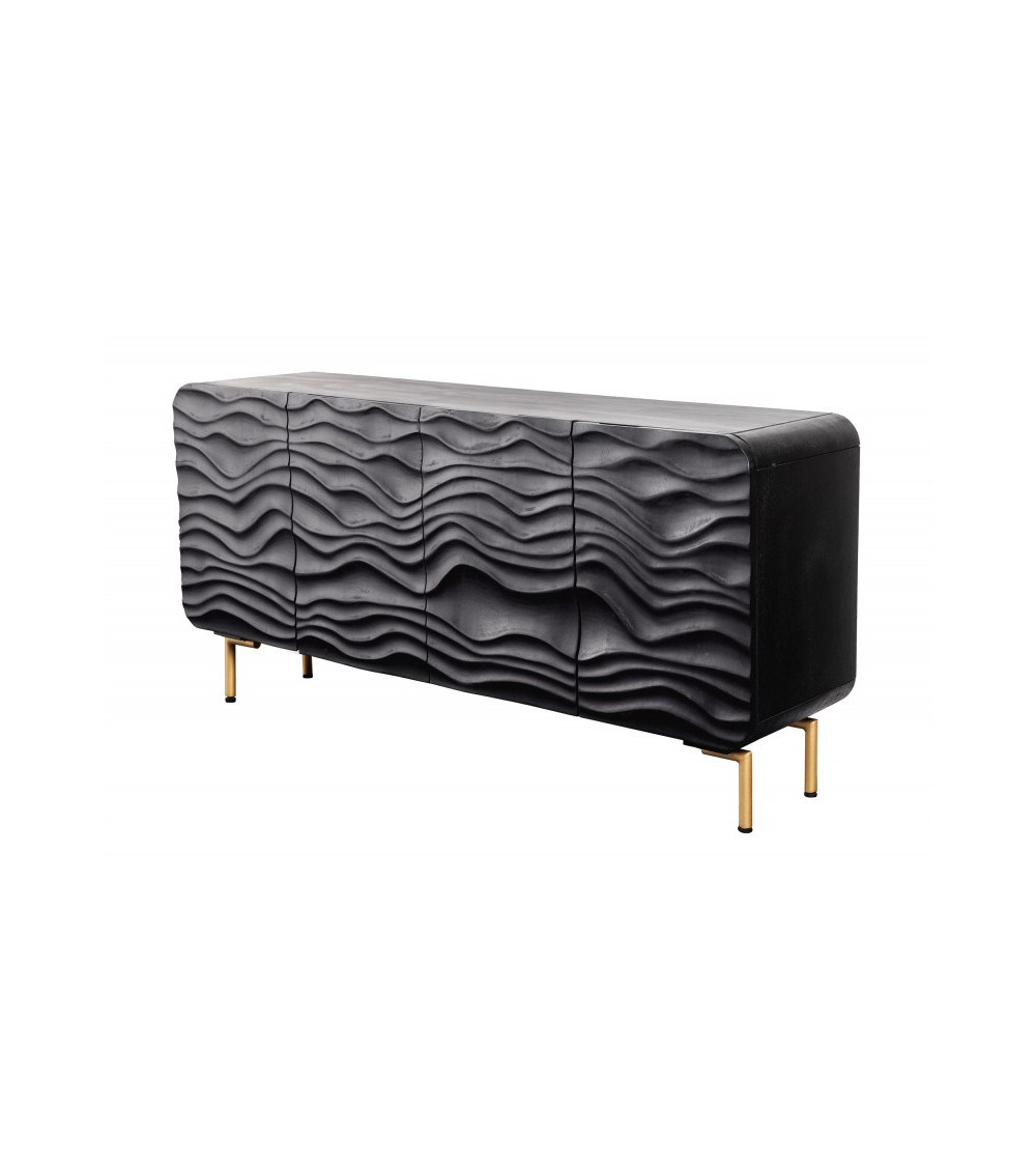 O corpo do aparador é preto, contrastando elegantemente com as pernas douradas. O corpo é feito de madeira de manga lacada, conhecida pela sua durabilidade e beleza natural, enquanto as pernas são feitas de metal revestido a pó, garantindo uma óptima estabilidade e robustez.
