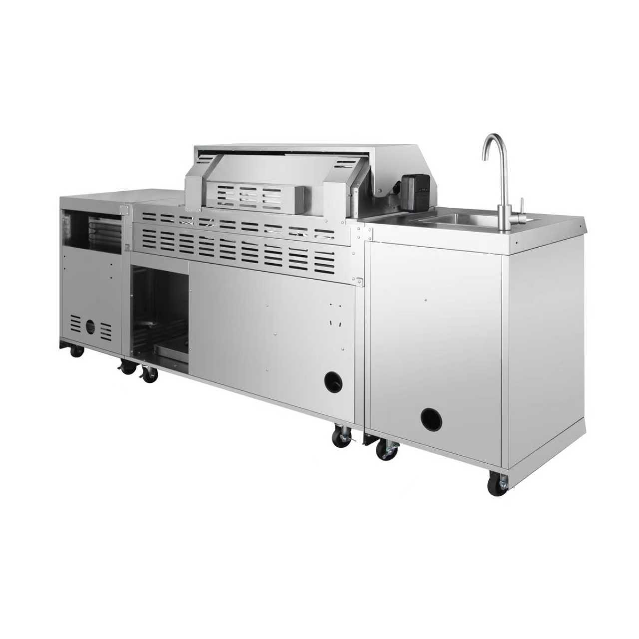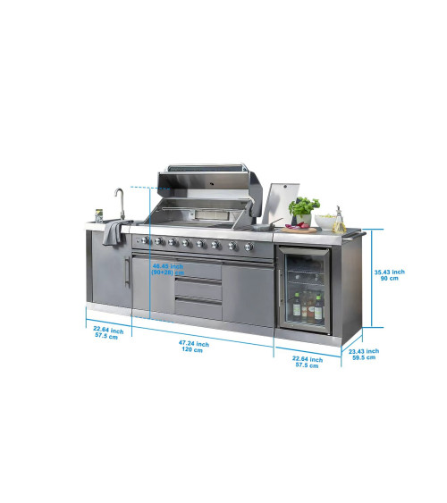 A sua ampla área de trabalho inclui uma pia funcional e um grelhador com 6 queimadores potentes, ideais para preparar carnes, legumes, peixes ou frutas grelhadas.