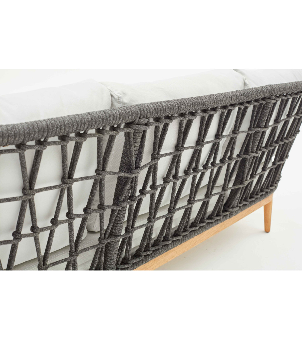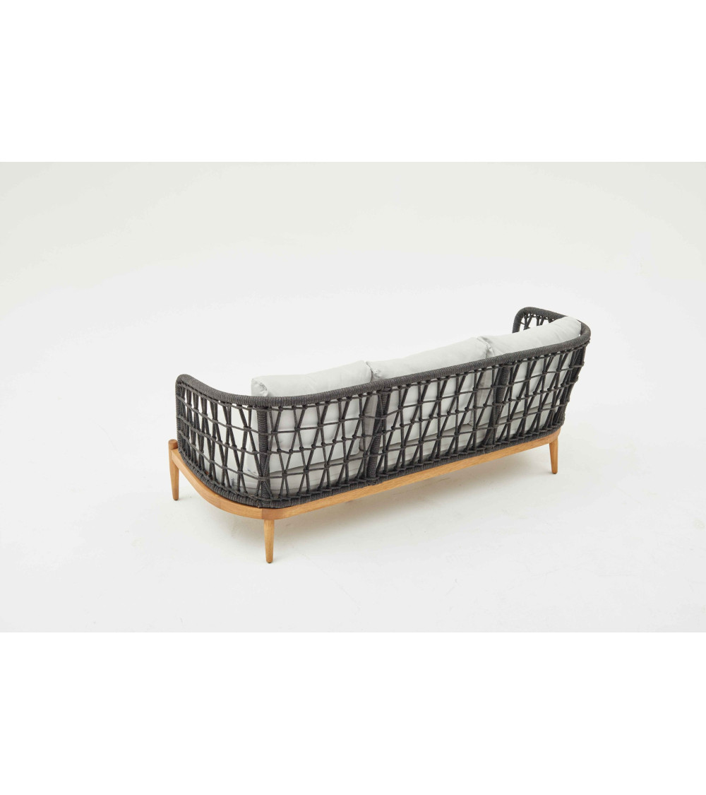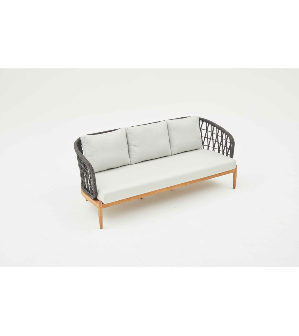 No centro deste conjunto, o sofá de 3 lugares destaca-se pelo seu design elegante e funcionalidade. Revestido por um tecido cru macio e confortável, convida ao relaxamento e ao convívio. Seu assento espaçoso oferece ótimo conforto, enquanto seu encosto em tecido cinza traz um toque de modernidade e originalidade. Este sofá é o elemento central perfeito para relaxar e desfrutar de agradáveis momentos ao ar livre.