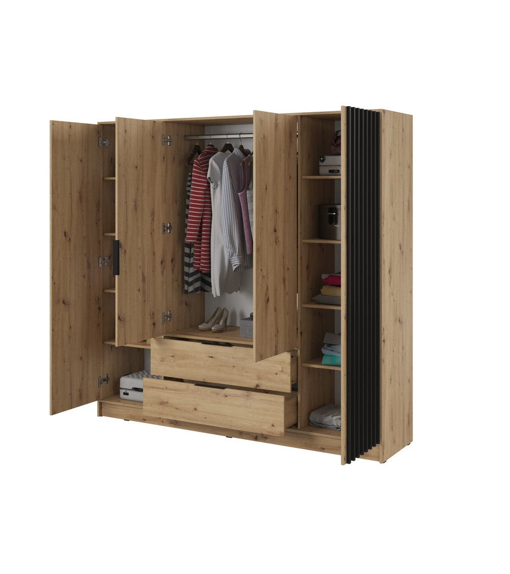 Descubra o nosso elegante e funcional guarda-roupa MELODIE de 4 portas, que combina o charme do carvalho com detalhes inteligentes.