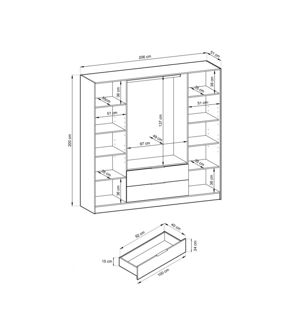 Na parte inferior do armário, duas gavetas proporcionam um espaço de armazenamento conveniente para itens dobrados, acessórios ou qualquer coisa que você prefira manter bem organizado.